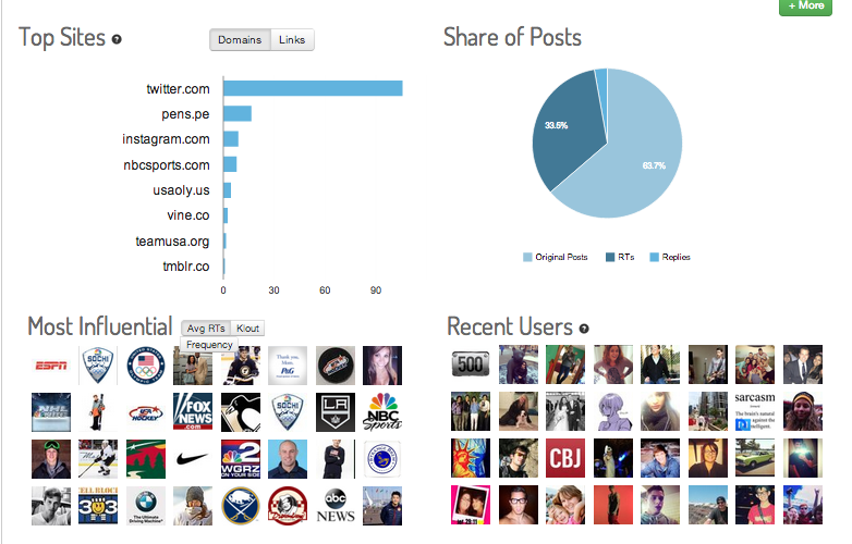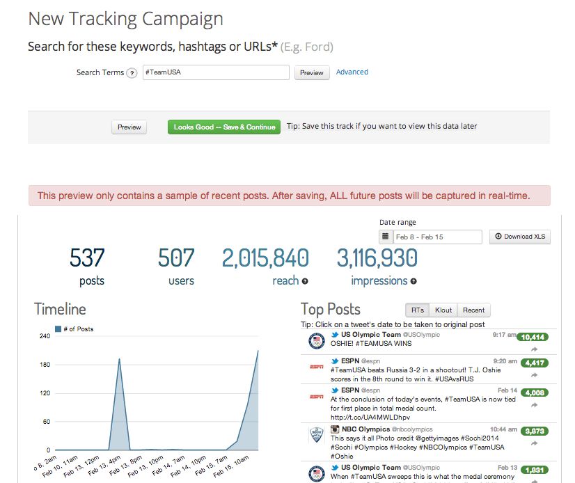 On the dashboard (in this case for #TeamUSA), you can see the conversation, the numbers around tweets, users, reach and impressions. You can see who had the most top posts by retweets, Klout score or most recent tweets for the topic.